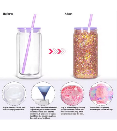 Ce gobelet tumbler snowglobe en plastique double paroi 16 oz est le support parfait pour les techniques de DTF UV et de vinyle adhésif. Sa conception à double paroi permet l’ajout d’éléments décoratifs (liquides, paillettes, effets visuels) pour créer de véritables tumblers snowglobe personnalisés, très appréciés dans l’univers du DIY et de la personnalisation.