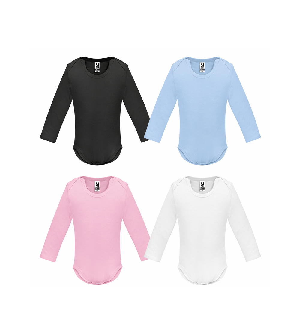 Body bébé à manches longues vendu vierge, prêt à personnaliser par flocage, DTF ou autres techniques de marquage textile. Confort doux, pratique avec fermeture pressions.