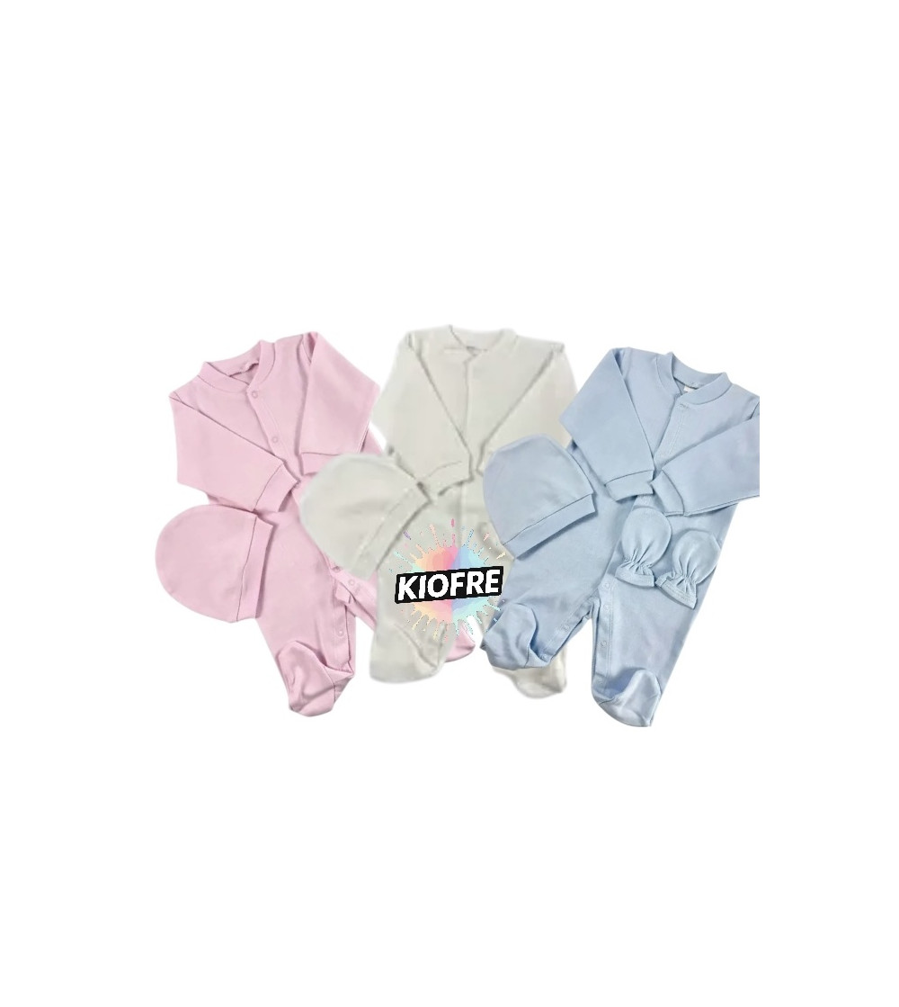 Set 3 pièces en coton personnalisable vierge à marquer comprenant pyjama, bonnet et moufles. Conçu pour flocage et personnalisation textile, idéal pour créations uniques et cadeaux.
