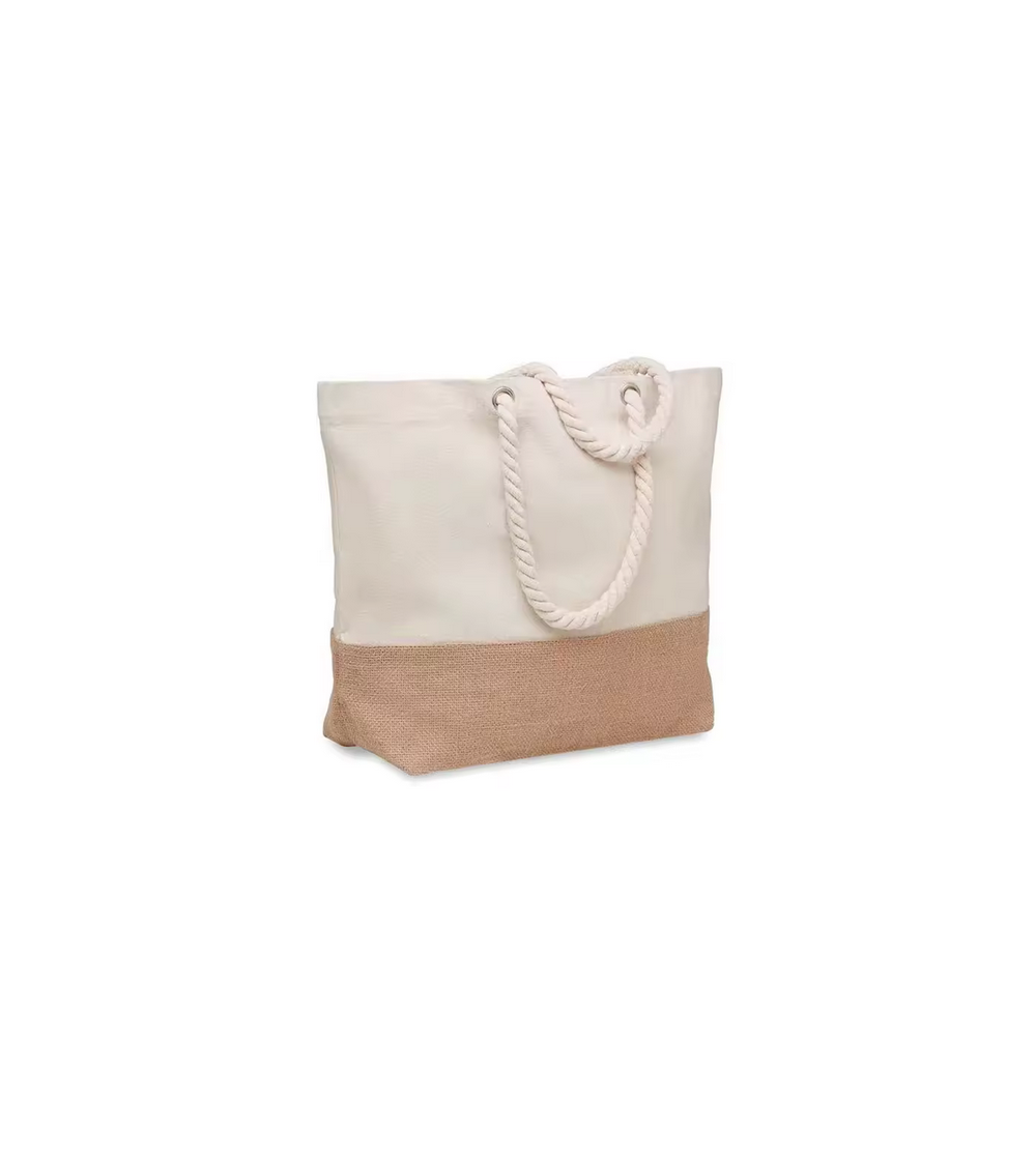 Sac durable et élégant en coton et jute avec anses en corde. Idéal pour vos courses, sorties ou usage quotidien. Respectueux de l’environnement et pratique.