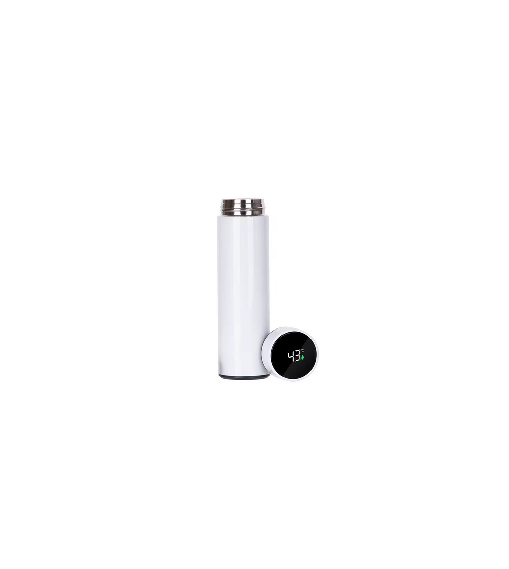 Thermos gourde de 450 ml équipée d’un capteur de température intégré. Compatible sublimation pour personnalisation. Idéale pour boissons chaudes ou froides, pratique et design.