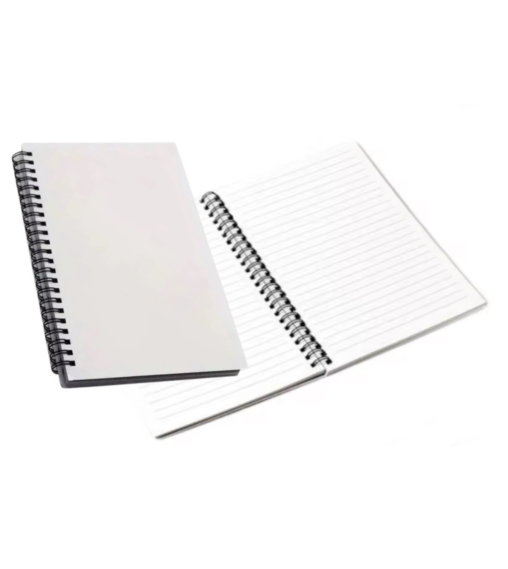 Cahier A5 à spirale avec couverture sublimable en plastique. Idéal pour personnalisation : prénoms, logos ou motifs. Parfait pour cadeaux, papeterie créative, écoles, artisans et boutiques de sublimation.