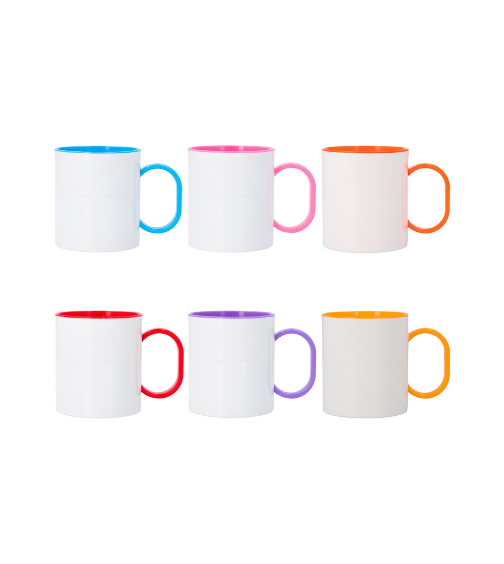Mug en polymère 11oz, intérieur et anse colorés. Ultra-léger, incassable et spécialement conçu pour la sublimation haute définition. Idéal pour les créations personnalisées, enfants, camping, écoles et boutiques sublimation.