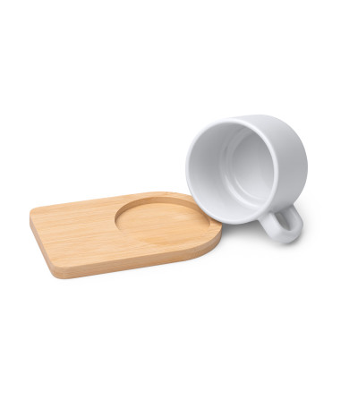 Le plateau en bois naturel permet de présenter le mug avec élégance tout en protégeant les surfaces.