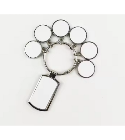 Porte-clés avec 7 breloques en métal/plastique, conçu pour la sublimation. Idéal pour créer des cadeaux personnalisés ou objets promotionnels uniques.