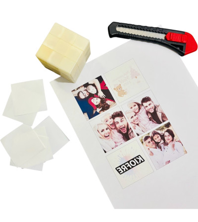 Veillez à centrer votre visuel et utiliser du ruban thermique pour bloquer l’adhésif en place. L’impression doit être réalisée sur les adhésifs fournis avant application sur le cube. Kiofre